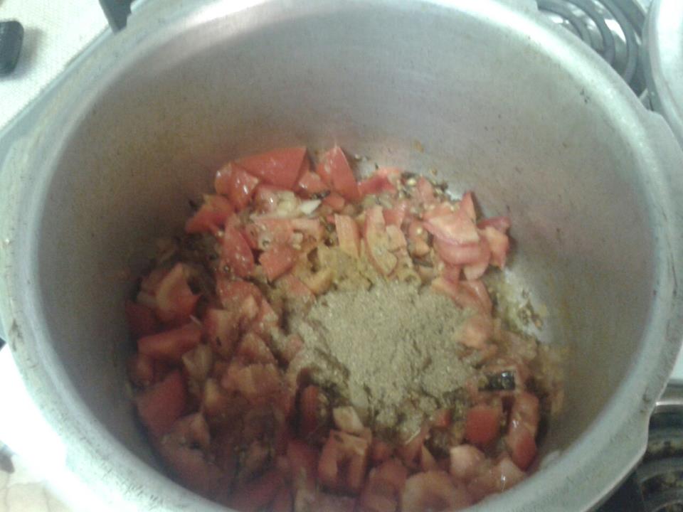 Chop the onion into as small pieces as you can and add to a frying pan that has about two table spoons vegetable oil and cook till beginning to caramelise (not too much or the curry will be too sweet). Add this to a pressure cooker along with the finely chopped tomatoes and red pepper and the whole seeds. Add in about a table spoon ground corriander, turmeric, and if you have it, paprika.