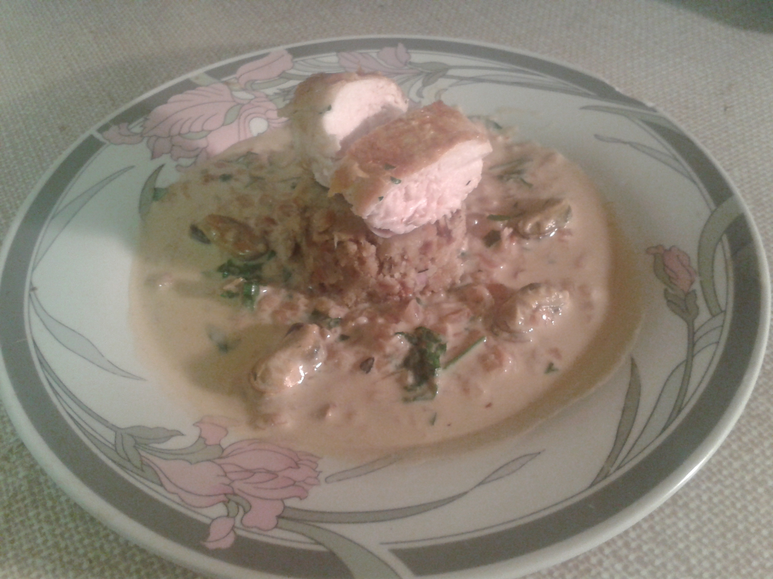 I think the chicken is slightly overdone which annoys me; I should have left it in the oven for about 7 minutes instead of ten; the parsnip mash is also a bit dry and could have used a bit more of the herb infused butter it was cooked with and maybe should have been roasted over a lower heat; the sauce would have been nice but every time you catch a mussel it becomes rather unpalatable and you really pick up on that sickly, sour, dried seaweed, weird fishy taste they have.