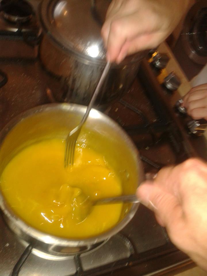 Make a roux with the curry mix then transfer to a saucepan containing a half pint of water and bring to the boil ‘whisking furiously’ throughout . The mixture will thicken over the next minute at which point you will remove from the heat and set aside for service.