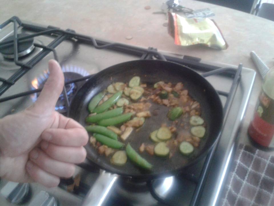I first add the ginger, garlic and chilli into a pan for a couple of minutes to soften. I then add the vegetables, the cat food and the sauces and flash fry for another 90 seconds. At this point I was expecting the frying cat food to smell unbearable but interestingly it doesn’t give off any odour when cooking.