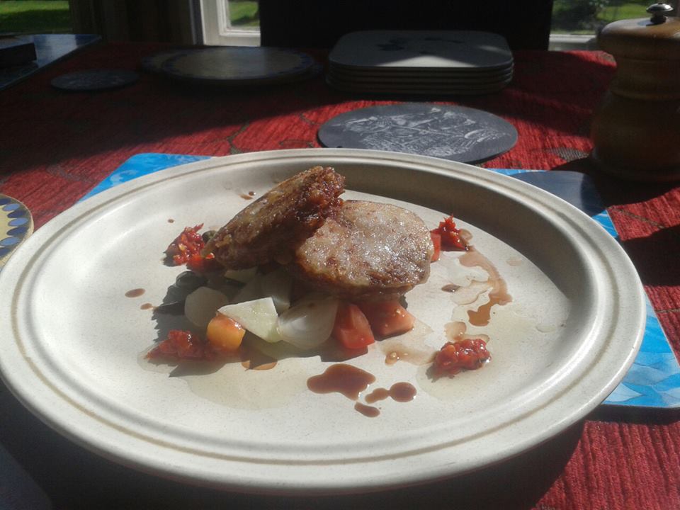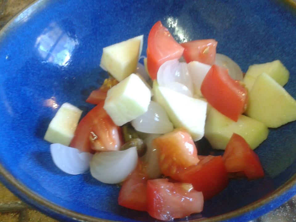 Couple apples, tomato (skin), capers, pickles, onions slices, I reckon need to cut the richness of the sausage really.