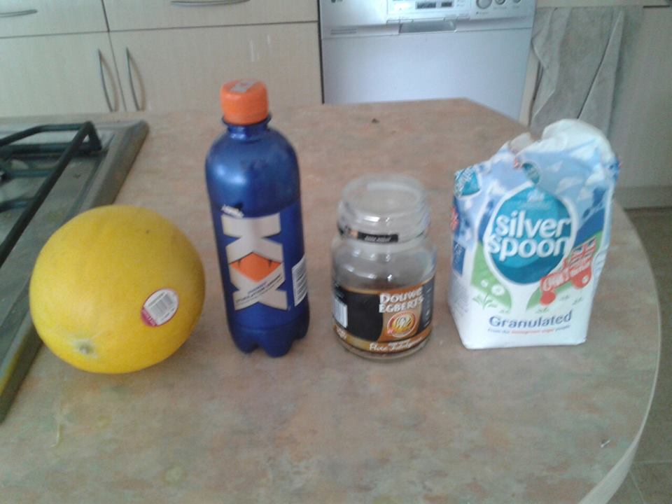 A melon, coffee, some sugary energy drink and sugar! This thing is going to blow my mind!