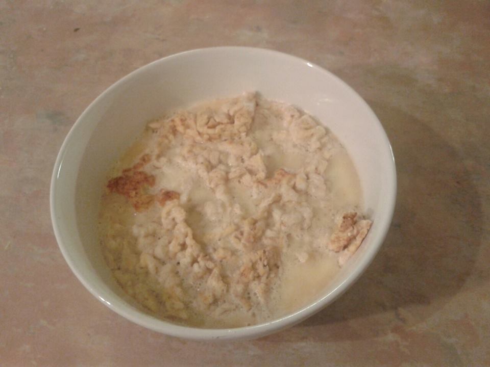 I reckon my professional chef’s oven was on at about 90C because the custard has split slightly, having said that it still tastes nice. The rice cakes I guess are tender but have a chewy consistency and slightly malty taste which I don’t like now. So overall, I’m going to give this a marginal fail. But! follow these instructions with nice panettone and you will have a kick-ass bread and butter pudding!