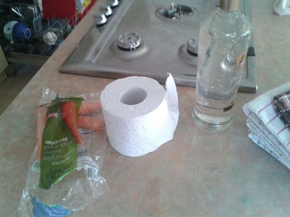 The bottle of Goldshlager, toilet roll and carrots. Roger me sideways through a disused well this is going to be hard, but I reckon i can come up with an amazing idea using all these ingredients!