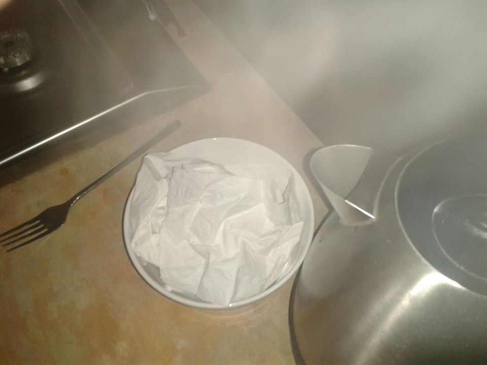 I start by adding boiling water to some toilet paper:
