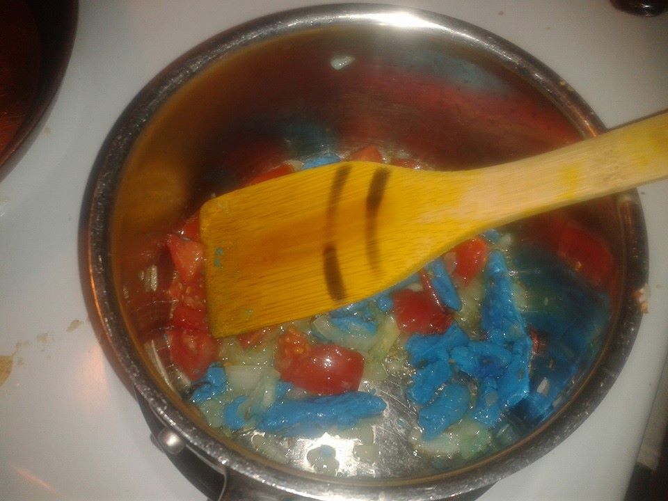 I begin by softening the onions, tomatoses and spices and Playdough in a pan: