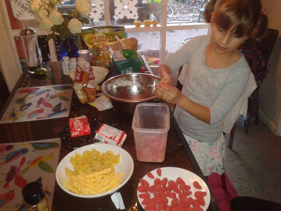 Here’s HC’s daughter preparing some strawberry sweets: strawberry jelly, milk powder, honey, powdered sugar, almond flavouring. This mixture is blended till smooth and shaped into wee shapes. These were super good and tasted legit harribo style.