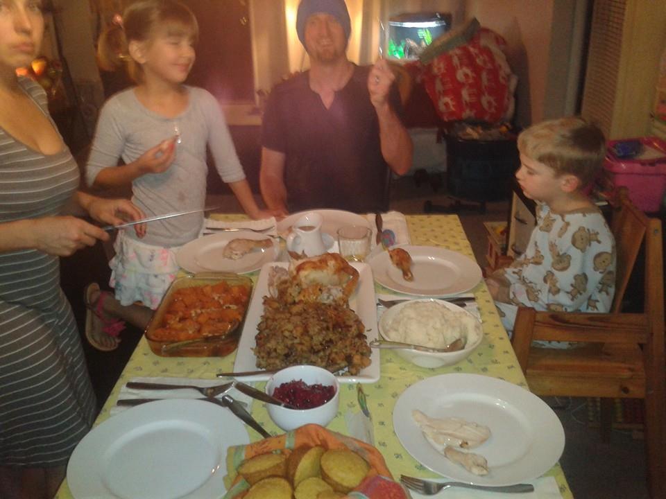 So here’s the final meal! In addition to the chicken and other stuff I mentioned we have mashed potato, corn muffins (corn meal flour, butter, honey, baking powder, eggs, milk, sour cream; super nice), cranberry and apple sauce, gravy, grilled yams and brown sugar…FYI HC is far left and looks really unhappy because she thought she over-brined the chicken.