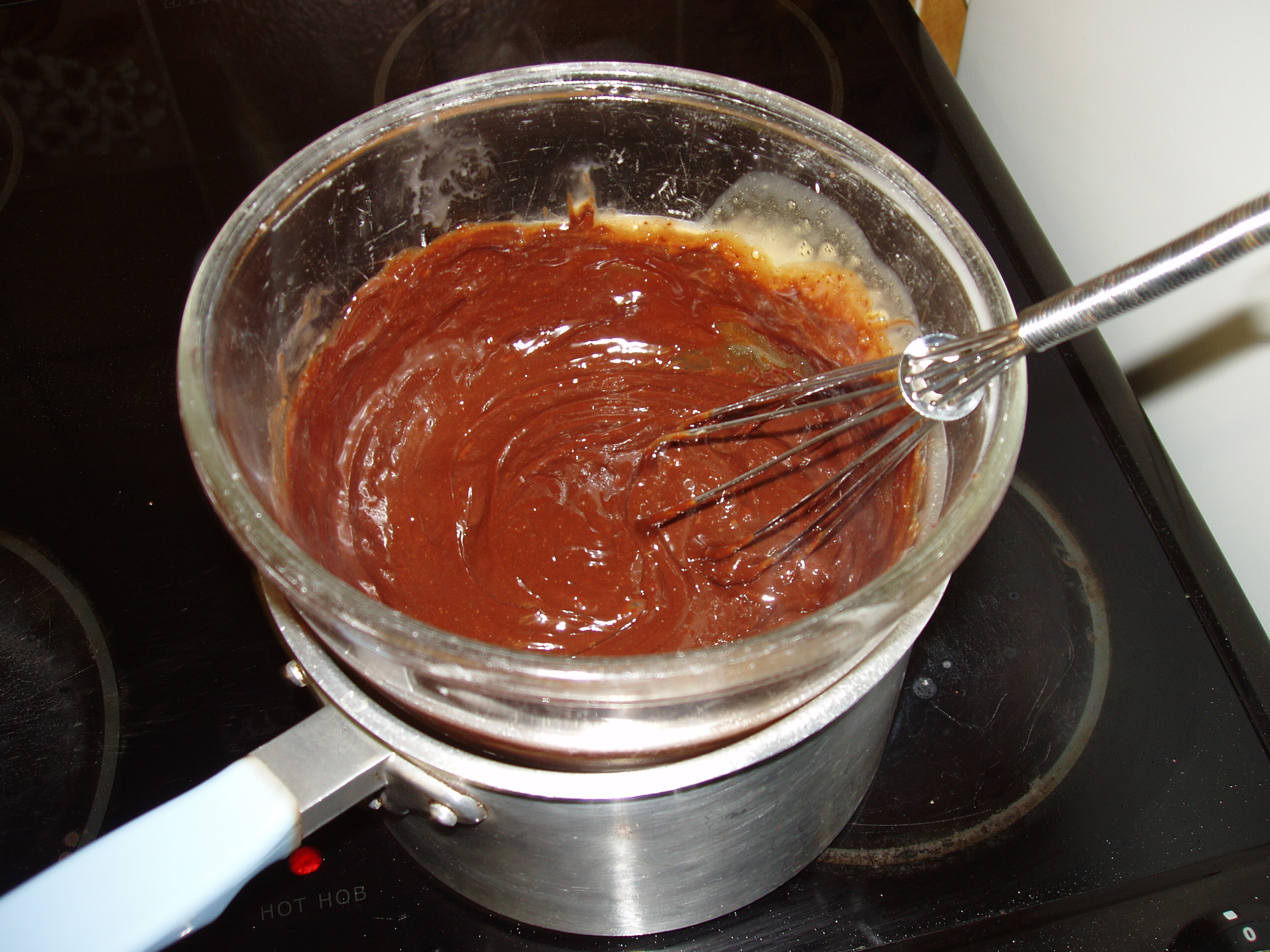 Like that, see! FYI I’ve used 50g of the 72% dark chocolate because I want a nice strong chocolatey filling…Also, you have to be super sharp on your timings here otherwise the eggs will cook; I used a finger dip method ie just too hot too touch (~60C)