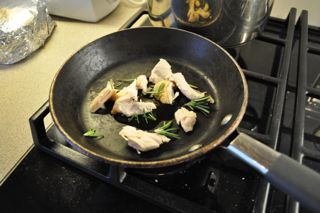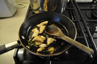 After about 3 minutes cooking on a high heat, or until the chicken has just started to colour, I deglaze with about 25mls Malibu: