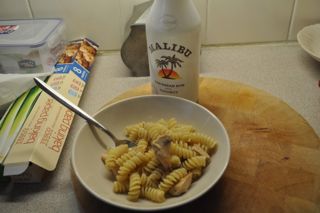 Well, the rosemary works; the feta, cream, lemon, salt, fusilli, pepper, they all work….but the Malibu comes in waving it’s massive coconuts all over the place and makes everything taste like a bizarre sweet porridge. It’s edible but sure isn’t something I recommend you try, but I tell you what, you can certainly do it without the Malibu for a really nice chicken and pasta dish. Maybe use fresh parmesan for a real umami kick. mmmmmm…..