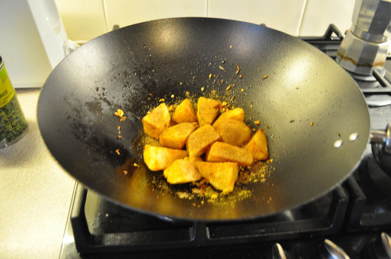 Which I start by turning the gas all the way up and by adding the fennel and cumin seeds. FYI 2: this will build up an extra crispy coat (surface? covering? outside?) and will take around 5 minutes or until the potatoes have gone golden brown.