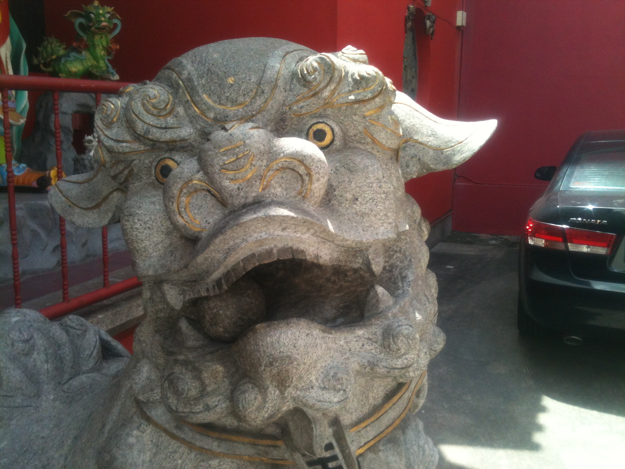 This is a picture a massive stone dog like the ones out of the film Ghostbusters.