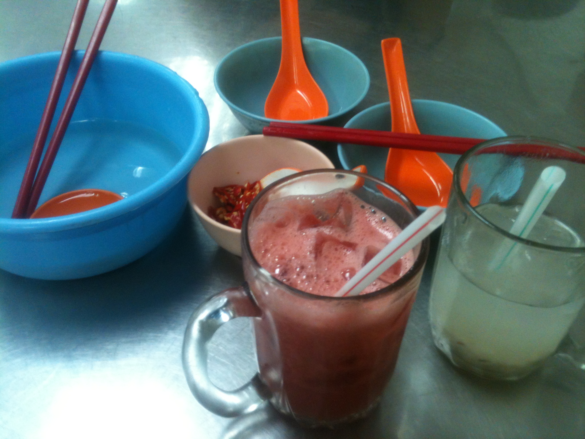 We only had one meal on day 2 and before we got it we had fresh watermelon juice (L) and barley water (R), the latter tasting of sugar puffs and sugary water. Nice! And you’ll also notice empty plates with some water in them; this is boiling water and it’s used to sterilise everything.