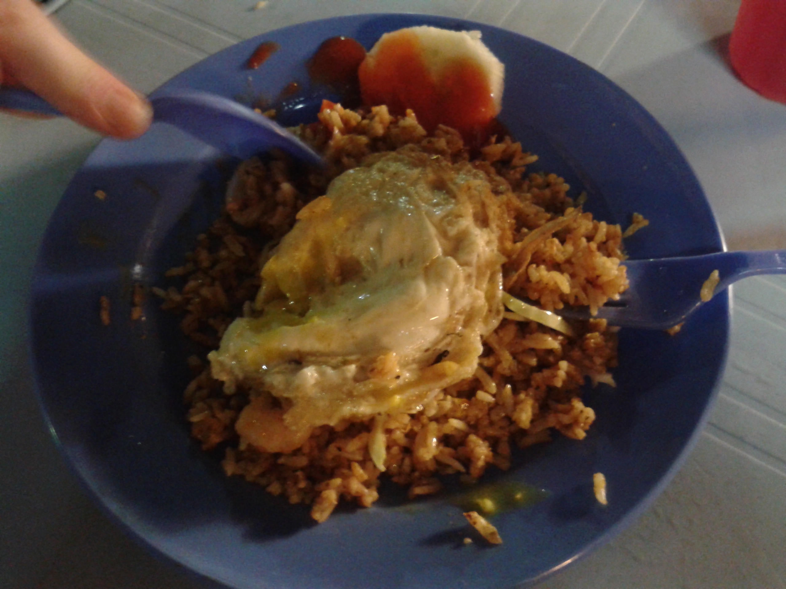 This is Nasi Lemak with coconut rice, prawn crackers, half a boiled egg, and cucumber. I didn’t like it because there was anchovies in it and I think anchovies taste like cat food, but the rice was really nice I suppose.