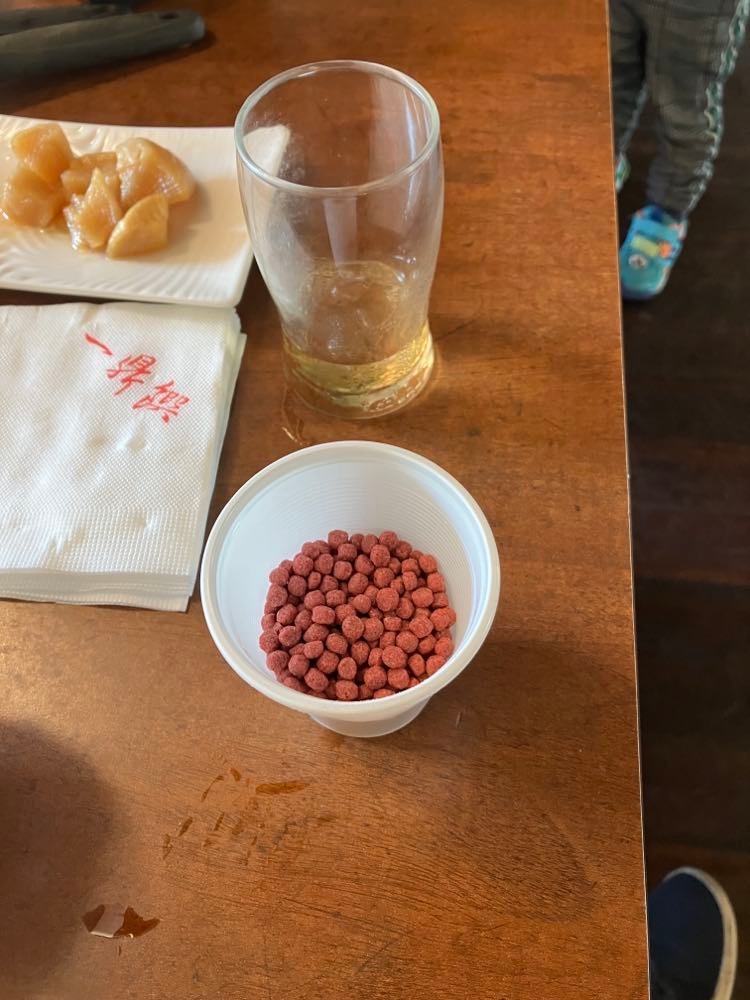 Next, an unusual treat when Gabriel turned up with this plastic cup of some kind of seasoning?