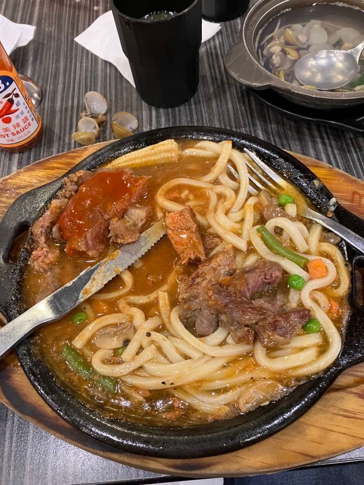 My wife suggested we try a traditional Taiwanese steak house and I ordered rib eye with noodles which came in a weird sticky sweet sauce: